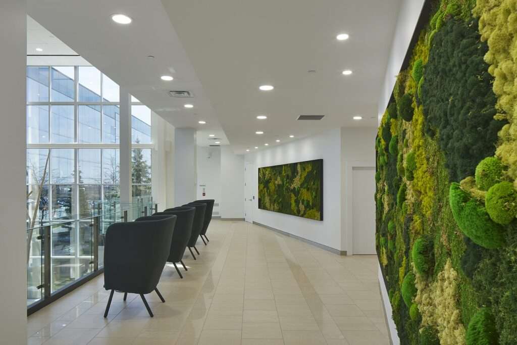Recognizing the impact of natural elements on well-being, B|A integrated biophilic design throughout the space. Green-toned upholstery, revitalized semi-circular gardens, and sculptural kiln-dried trees replaced artificial greenery, enhancing the sense of calm. Two large moss walls on the mezzanine level further strengthen the connection to nature. “Bringing natural elements into workspaces can reduce stress and improve focus,” says Bartlett. “It makes a big difference in how people feel.”