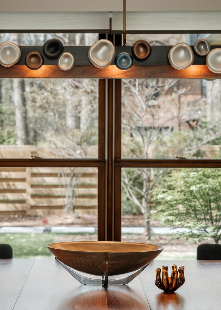 The chandelier is a collection of individual glass orbs, each hand-blown by the skilled team at Soffi Lighting. This means every single “pearl” has its own unique shape and character, just like the real thing. The arrangement gives a sense of organic composition, as if the pearls grew there naturally. These glass pieces are suspended from a canopy made of black walnut and metal with a special aged finish, adding a warm and earthy touch to the glowing orbs.
