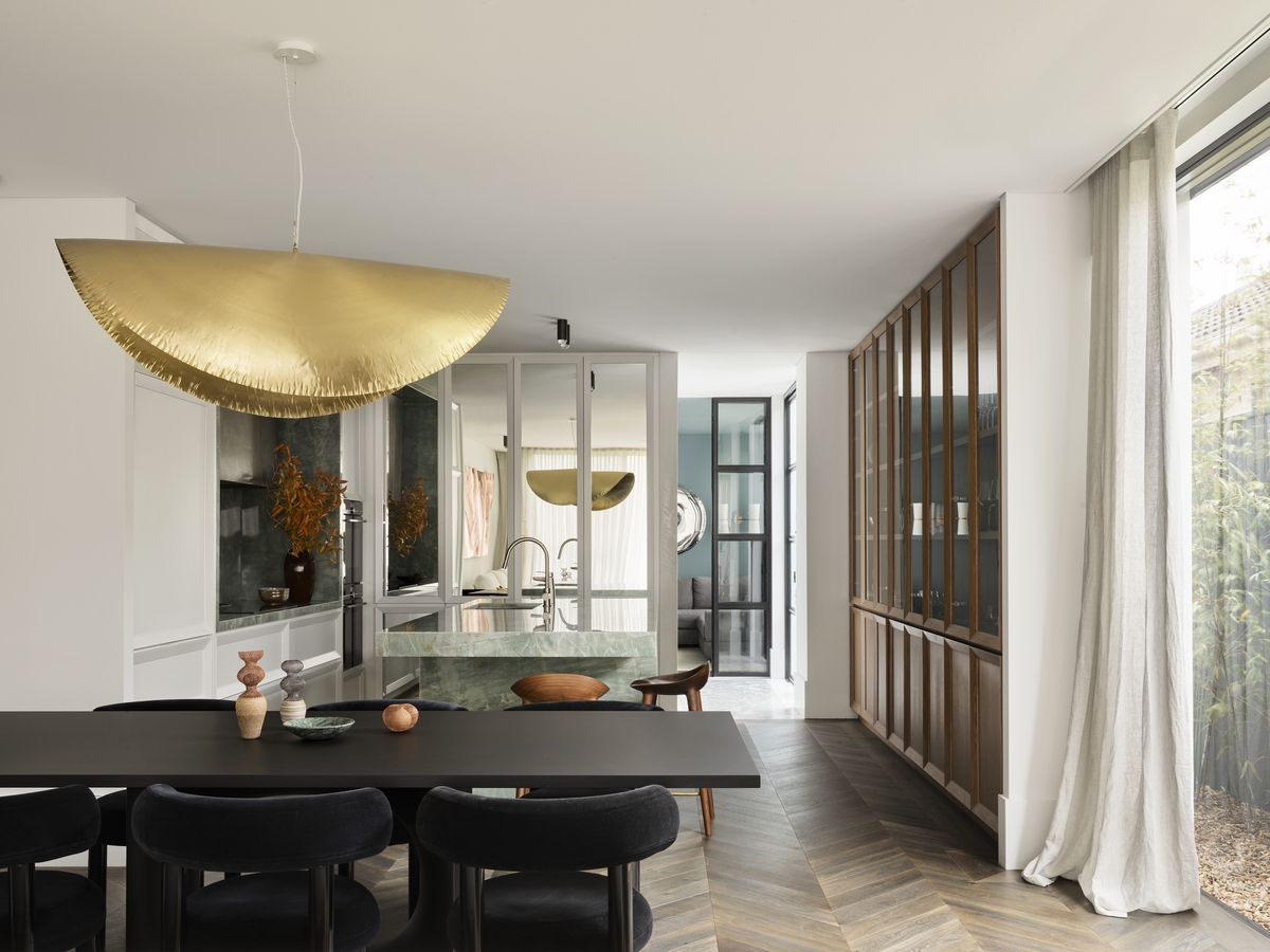 The owners, a young family, entrusted Smac Studio with extensive creative liberty, and the result is a captivating fusion of modern aesthetics with old-world European charm. The interior showcases exquisite Venetian plaster finishes, luxurious marble bathrooms, and timeless herringbone floors. Despite the narrow internal width of 4.8 meters and a shared wall without windows, the home radiates with abundant natural light and an abundance of sophisticated personality.