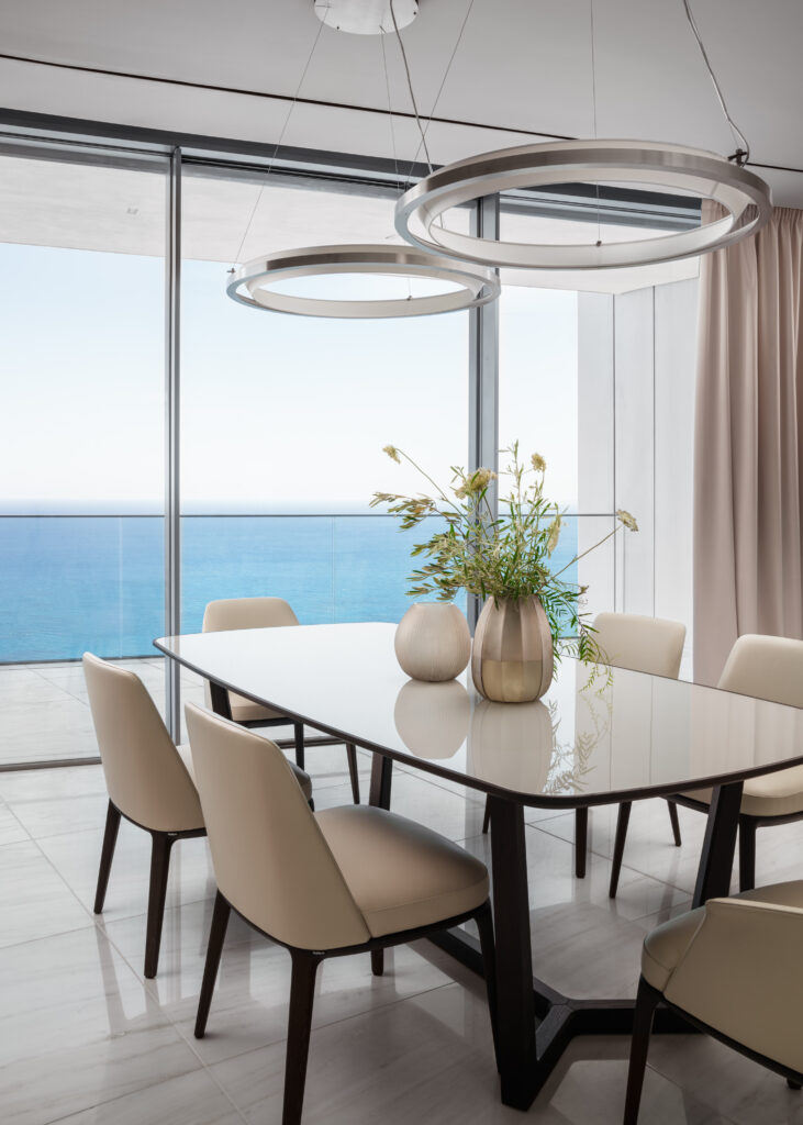 The endless blue sea and the gentle caress of warm sunlight inspired the Bolshakova Interiors team’s design concept for a luxurious three-bedroom apartment situated in a prime location along the seafront promenade of Limassol, Cyprus. This exquisite residence finds its home within Europe’s tallest seafront tower, known as ‘The One.’ This remarkable architectural masterpiece was designed by the renowned architect Hakim Khennouchi of WKK Architects and was completed in 2021 by the esteemed real estate developer Pafilia.
