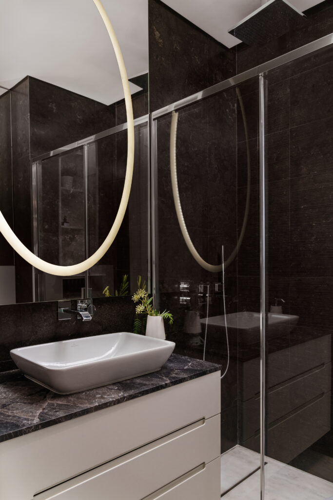 The 127 sq.m apartment comprises a master bedroom, a son’s room, a guest room, an open space kitchen and living room, and a spacious terrace. The living room features a spacious dining area, an open-space kitchen, and a social zone with a comfortable milky-shade sofa and library. The combination of marble and glossy surfaces reflects the natural surroundings of Limassol.