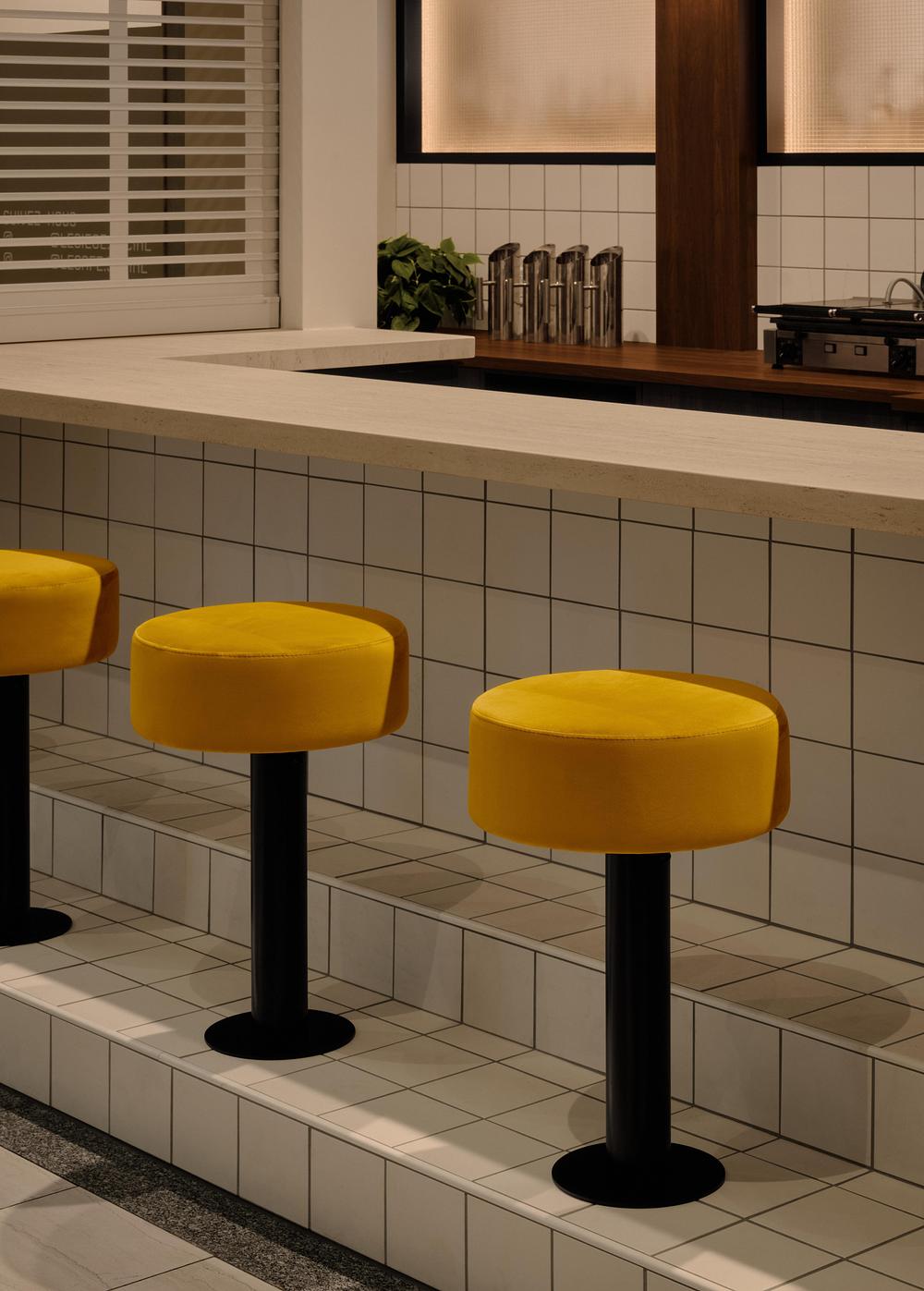 The coherence of the project has been achieved through a strong material theme. Square white ceramic tiles have been used on both vertical surfaces and built-in furniture. A walnut wall filters the light through glass openings, thus creating a delicate separation, while maintaining a visual dialogue between the bistro and the café. The atmospheres are enhanced by the precision of colours and materials. Mustard tones in the café are interrupted with dark wood finishes, while the bistro boasts an enveloping terracotta palette accompanied by light wood, deep greens, and integrated greenery.