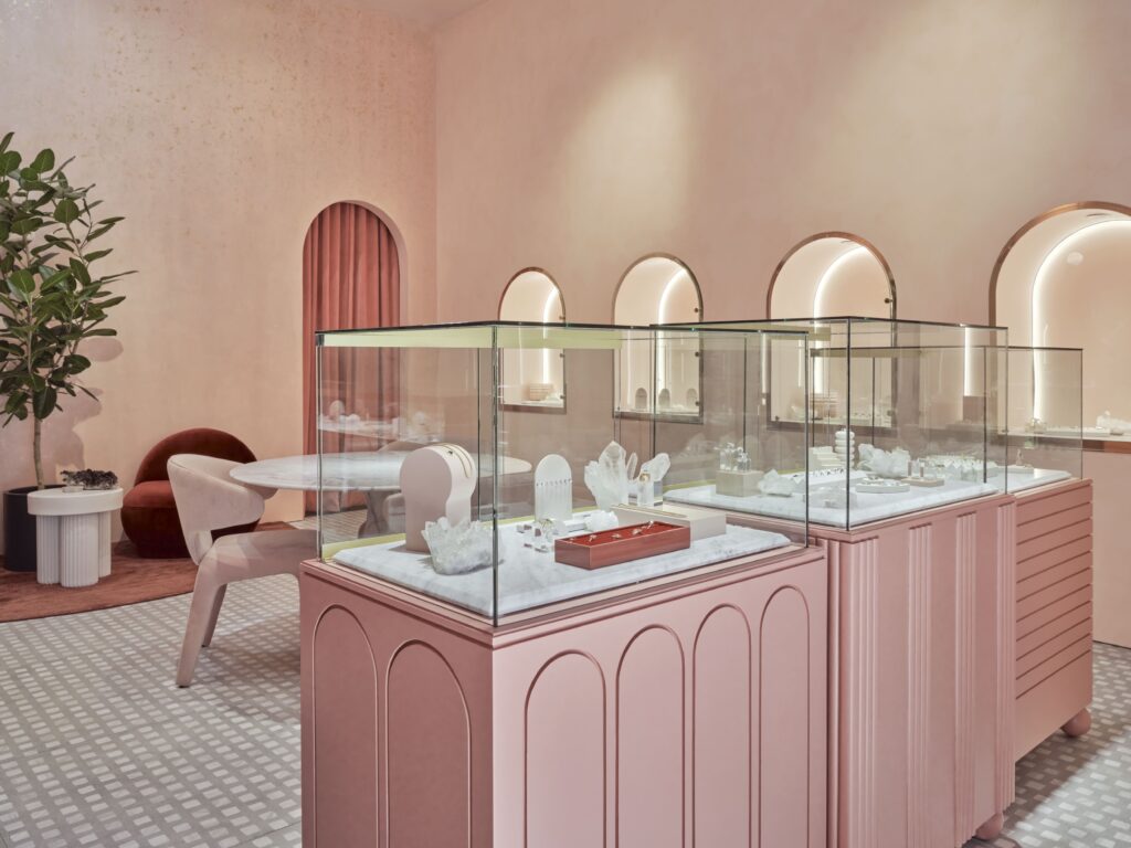 The mica infusion imparts a subtle, glistening effect on the walls when illuminated by the sun. Moving towards the back of the store, we find the “Babe Cave,” an intimate and exclusive salon area that has been treated to a royal makeover with an Art Deco influence. Within this space, a custom velvet couch gracefully embraces the pink gem fractal walls, designed to celebrate the store’s clients and their newfound treasures.