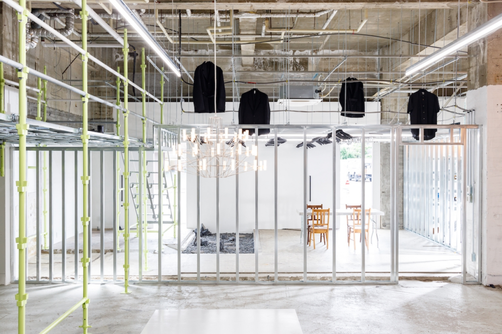 Furthermore, due to the extremely high ceiling, scaffolding was installed as a mezzanine floor and the space above the ceiling was also used as a display for clothes. By incorporating scaffolding, which had previously only been used as a temporary construction material, the ruggedness of the space stands out and is now recognized as a new material for the interior. The newly created space has a high affinity with the image of the apparel brand and highlights the specificity of the brand and products in a creative way.