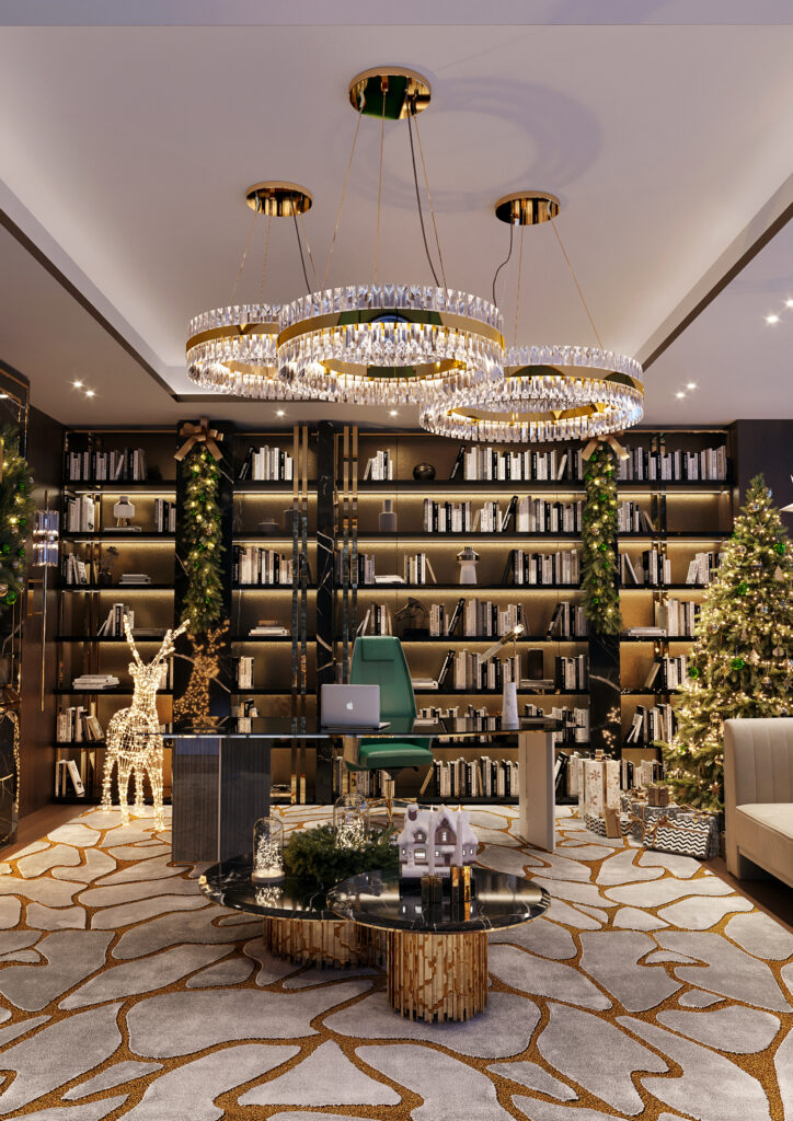 Playful Complements for the Home Office: Even the home office, often overlooked during the holiday season, transforms into a hub of festive creativity. Introducing bespoke furnishings such as the Algerone desk, the Empire Set III center table, or the Liberty Slim suspension lights turn the home office into a Christmassy haven. Playful Christmas decor elements, including a reindeer lighting sculpture, gingerbread houses, and nutcracker figurines, add a whimsical touch, infusing the workspace with holiday magic.