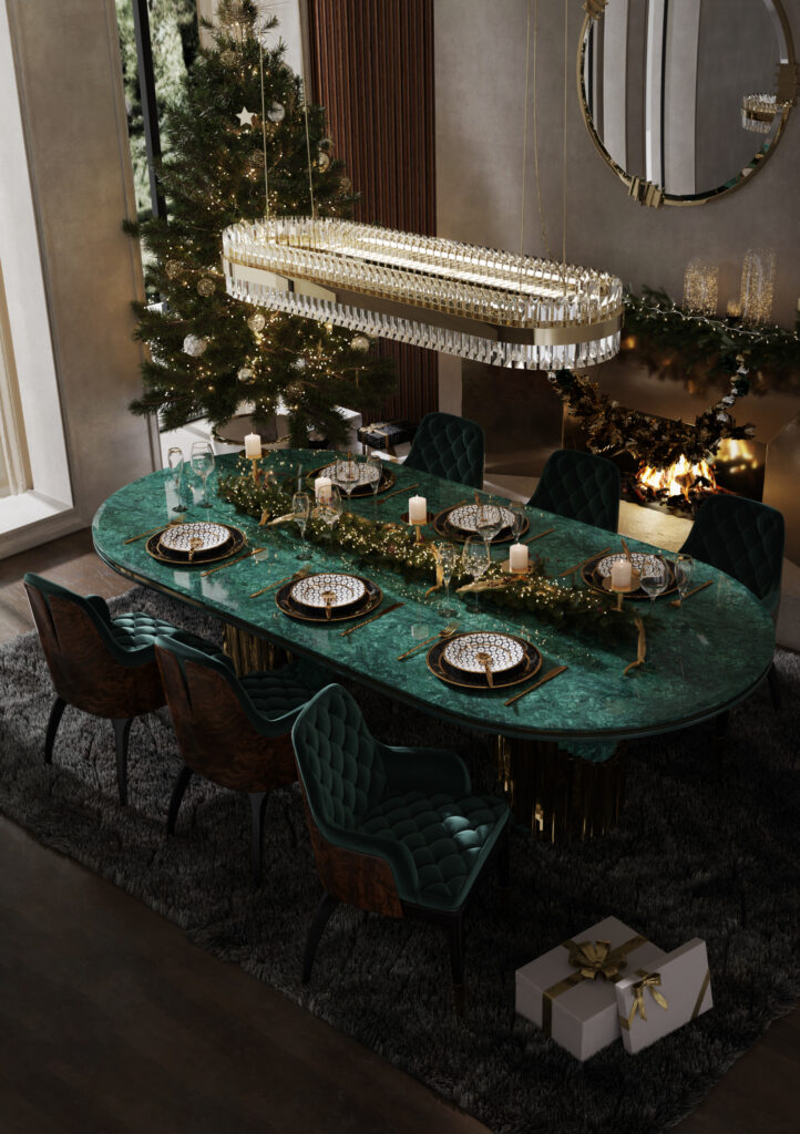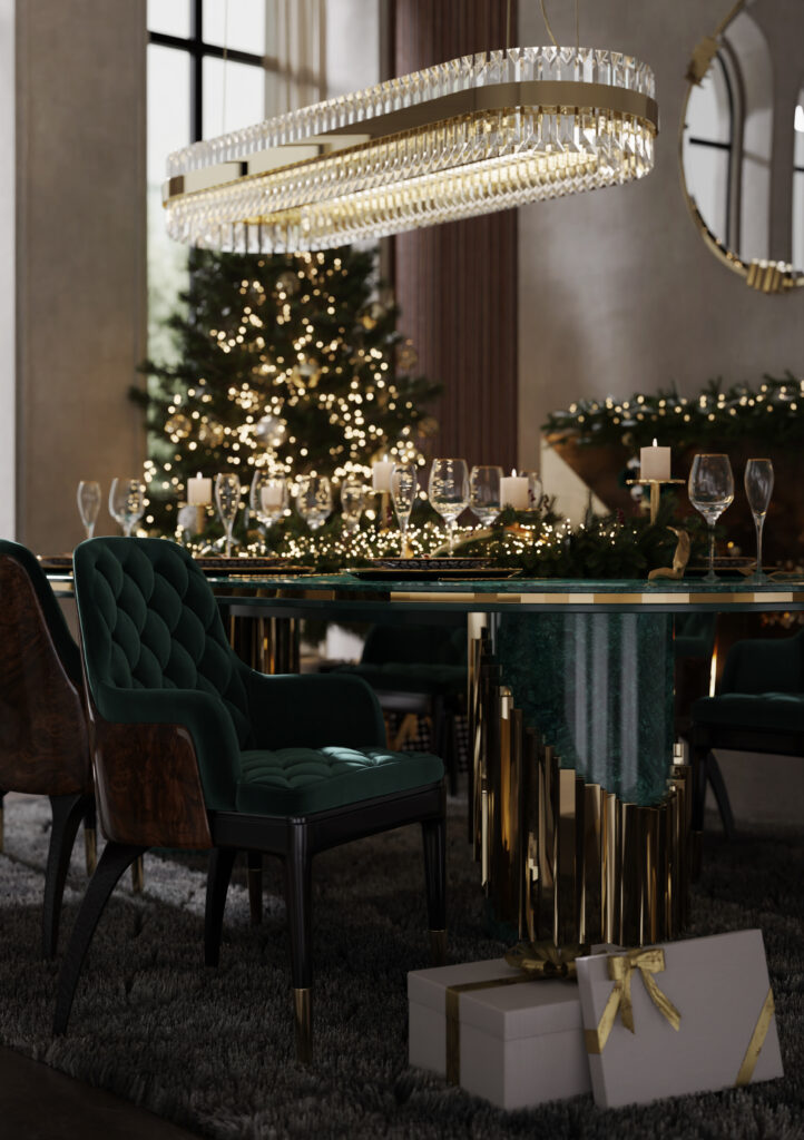 Bold Green Dining Table Delight: Green, a quintessential Christmas color, takes center stage in the dining area with LUXXU’s Littus dining table in emerald green. The Guatemala marble top adds an extravagant touch, complemented by the Charla dining chairs upholstered in a stunning dark green fabric for a cohesive look. Lastly, the Liberty Slim Snooker suspension rounds up the decor, casting a soft glow over this glamorous dining scene.