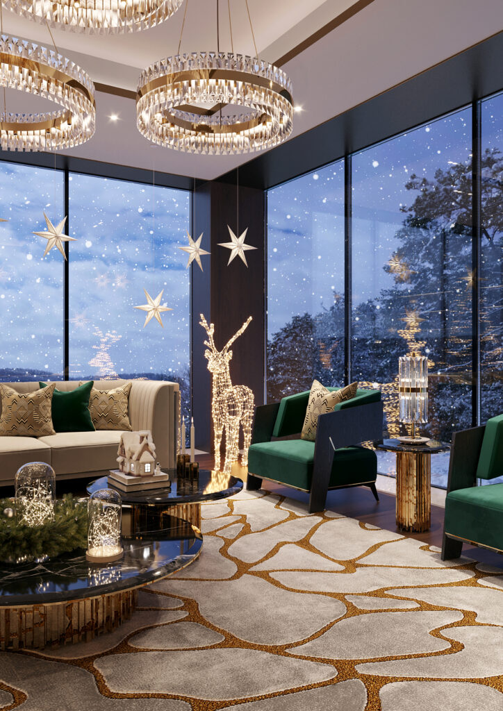 Luxurious Living Room Extravaganza: In a luxuriously adorned living room reminiscent of a chalet, every detail contributes to a Christmas haven. From garlands, bows, and baubles embellishing the beams to a magnificent tree stealing the spotlight with its cheery adornments, the living room becomes a showcase of festive elegance. The Gala chandelier is suspended in a vaulted ceiling with a reminiscent vintage appeal, perfect for the season. Other noteworthy design components include the Otto XL armchairs and the Algerone center table that bring additional detail.