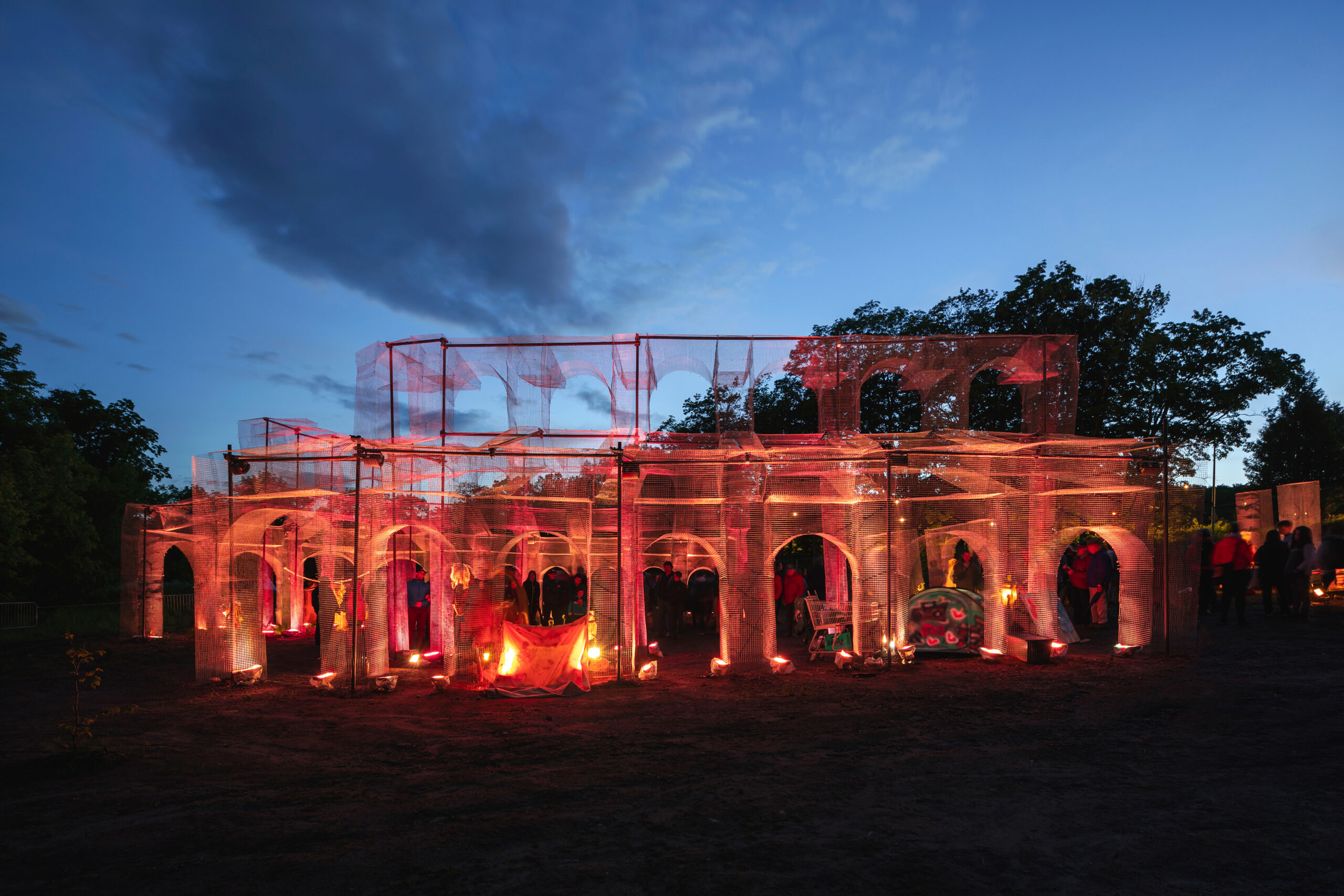 This large-scale project is unusual in that it is entirely hand-made, and its construction costs are low due to the use of modest materials. Designed to serve the artwork presented, the concept takes on its full meaning when illuminated, and comes to life when inhabited. This colossal set allowed the artists, as well as the spectators, to immerse themselves in an almost spectral world.