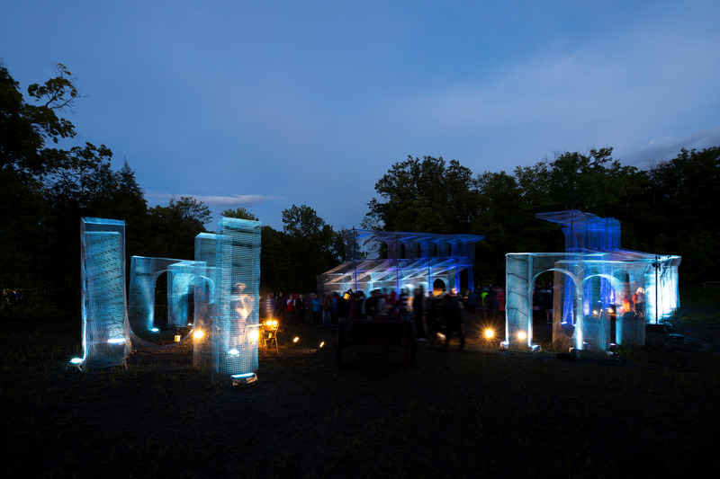Installed on the site of the recently destroyed Indo-Australian greenhouse, a large wire mesh structure shelters groups of individuals from all eras, from fur traders to climate refugees, who are constantly uprooted. Illuminated, the greenhouse-inspired structure is reminiscent of a zoo’s animals, who have also been uprooted from their environments. As the actors perform, the wire mesh arches take on a vaporous, ghostly look thanks to lighting effects. Sometimes warm, sometimes cold, the luminous tones accentuate the sense of urgency or serenity felt during the performance, allowing the structure to evolve at the same pace.