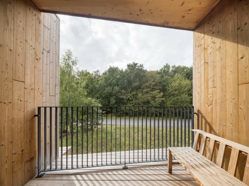 The design further exploits the computer-controlled fabrication method’s high accuracy and repeatable process to incorporate bespoke solutions at a lower cost than traditional construction methods. Different features such as elegant grills for natural ventilation are cut directly into the cross-laminated timber panels. In this way, the design studio demonstrates its holistic approach and the collaboration between manufacturing, design, and performance.