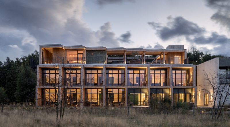 Timber is the primary construction material for the hotel, and it provides its structure, cladding, and insulation. The reasons for this decision are its sustainability credentials as well as its ability to lock away carbon.