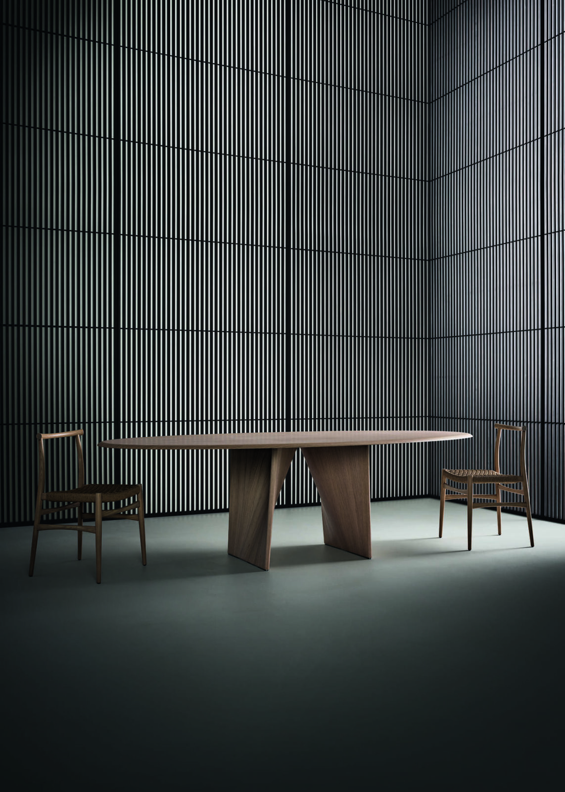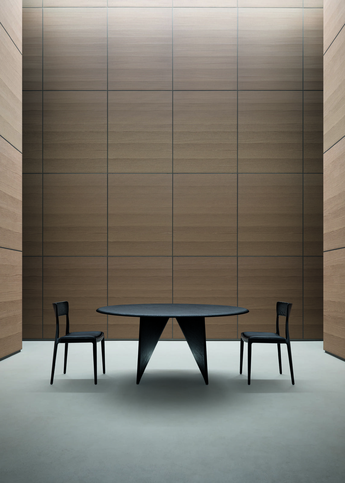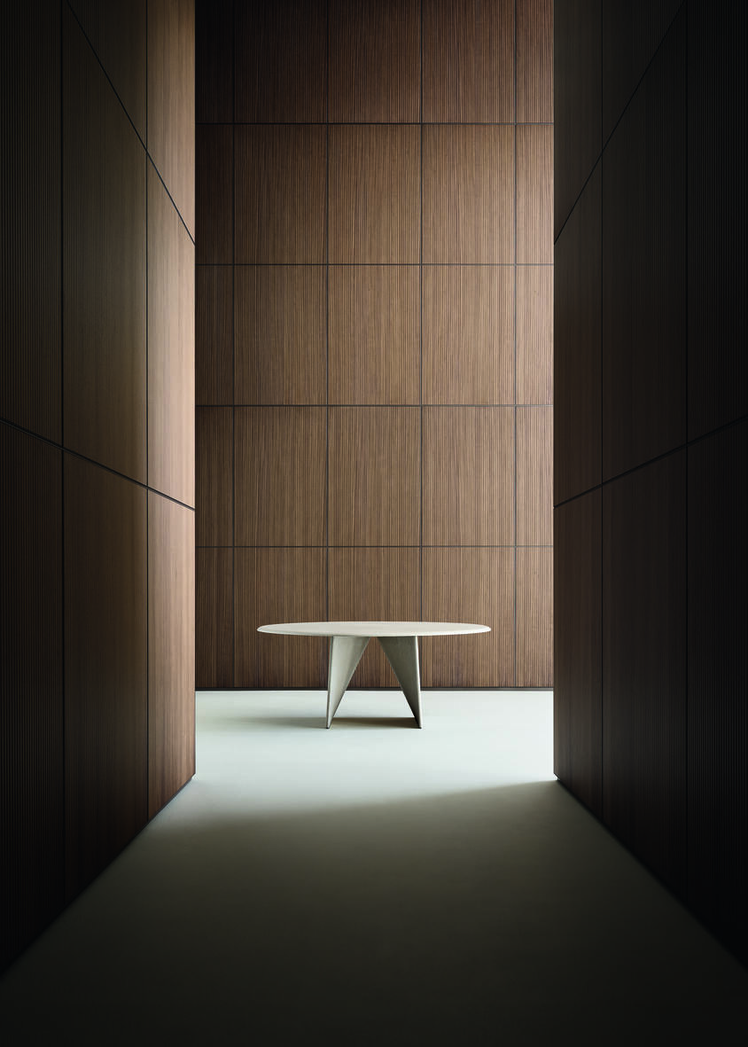 The Lambda table, which is a registered and patented model, is a clear example of Giuseppe Bavuso’s design philosophy for Rimadesio. It is an object of contrasts: it looks delicate but is built with heavy, solid materials. It is a piece of sculpture that is also a functional piece of furniture. More than just a standalone item, it is part of a larger strategic vision where every new piece, from its main shape down to its smallest detail, works together to create a complete and controlled environment.