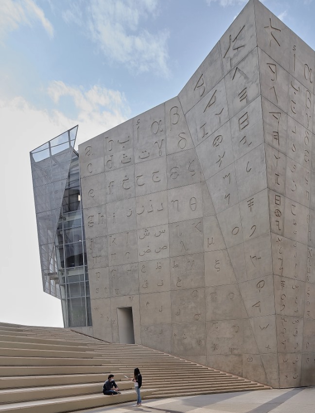 Above the amphitheatre, a concrete wall displays the carvings of the four alphabets historically used throughout the region. The designers incorporated passive features that were inspired by the local typology. These include the double outer skin which allows for shading, ventilation, and light diffusion, and the main open atrium which serves as a chimney vent.