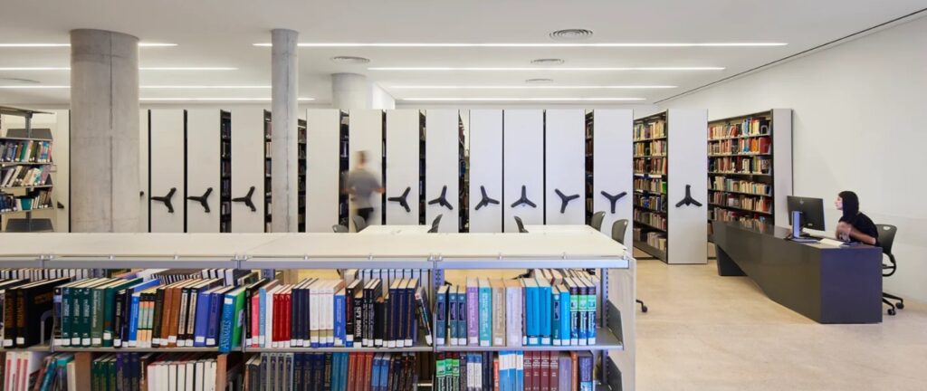 The J. G. Jabbra Library in Jbeil takes shape with dynamic forms and layered facades. This layered system provides shade and optimizes diffused natural light penetration based on the building’s orientation. The library’s interior is built around a large atrium that acts as a hub. It brings light and allows for natural air circulation. Moreover, the interior spaces are fluid, open, and transparent.