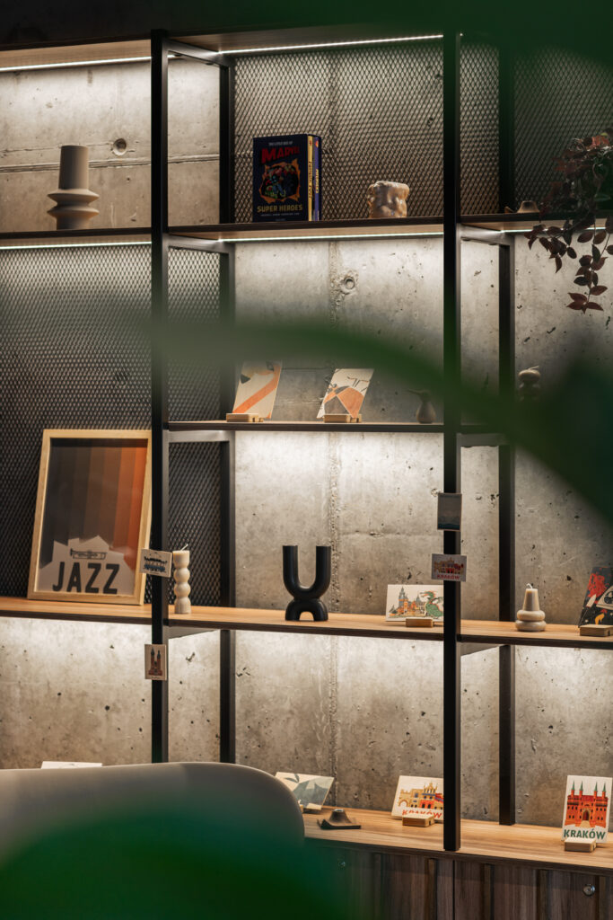 Hyatt Place Kraków’s interior design artfully plays with a myriad of contrasts. On one end of the spectrum, we immerse ourselves in the urban, industrial essence characterized by architectural concrete, resin, steel, metal mesh, and pressed sheet metal. Conversely, we’re met with the luxurious touch of elegant walnut wood, sandstone, travertine, and marble. The dynamic, vibrant, and colorful common areas stand in stark contrast to the serene ambiance of the conference rooms and relaxation spaces, creating a visually captivating and diverse experience for guests.