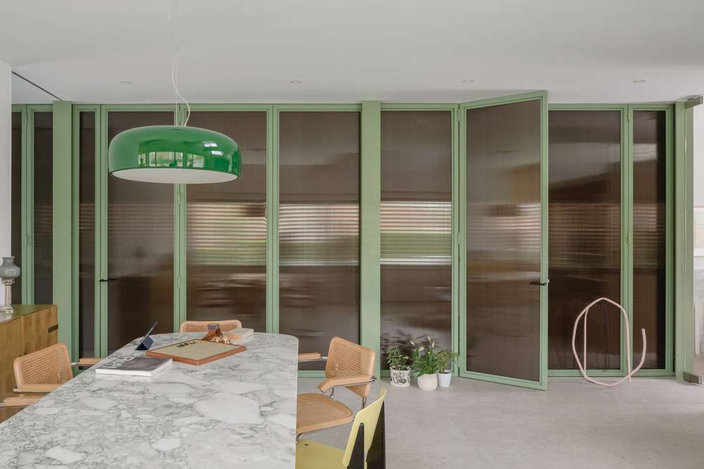 Additionally, the movable windows in the shed roof are coupled with automatic blinds to control heat and lighting. This creates a well-ventilated and comfortable interior. Solar panels, supported by the distinctive green steel structure on the roof, operate the underfloor heating throughout the house.