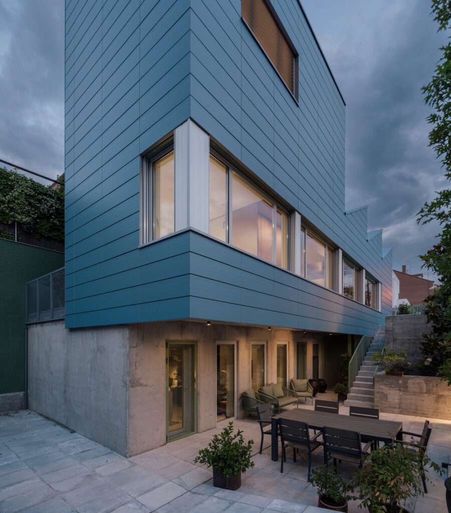The choice of a blue ceramic façade incorporates efficiency and aesthetics. On the architects’ recommendation, the clients opted for a rear-ventilated ceramic façade to ensure the building’s sustainability. It is not only durable but can also be dismantled and converted. The construction and the ceramic panels provide the basic concept of the best way to create a sustainable link between the present and the future.