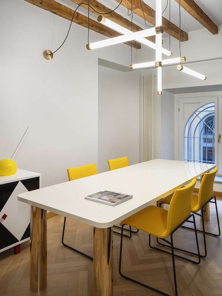 Upstairs, a large wall illustration by artist Carlo Stanga celebrates the city of Milan, surrounded by suspended LED lighting with glass diffusers. Black and gold details mix with bright yellow and red accents, while large arched windows framed by wrought iron open up to views of old Milan, making the upper level feel just as rich in character as the spaces below.