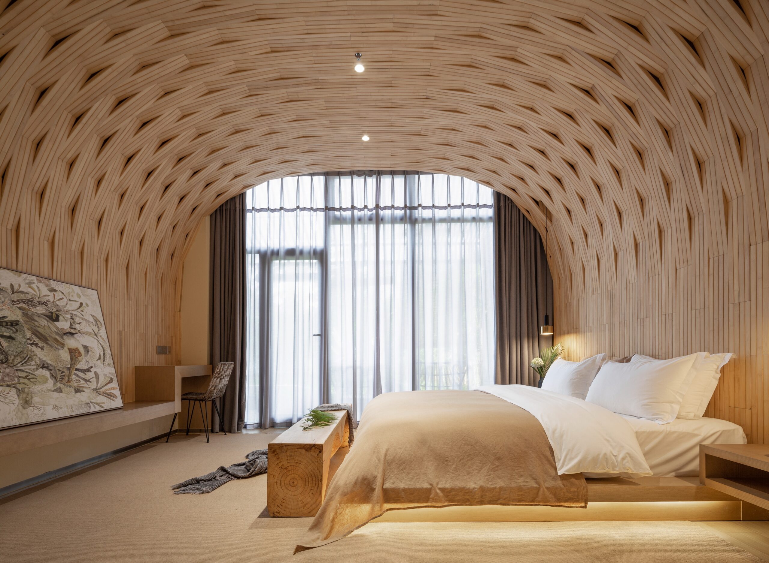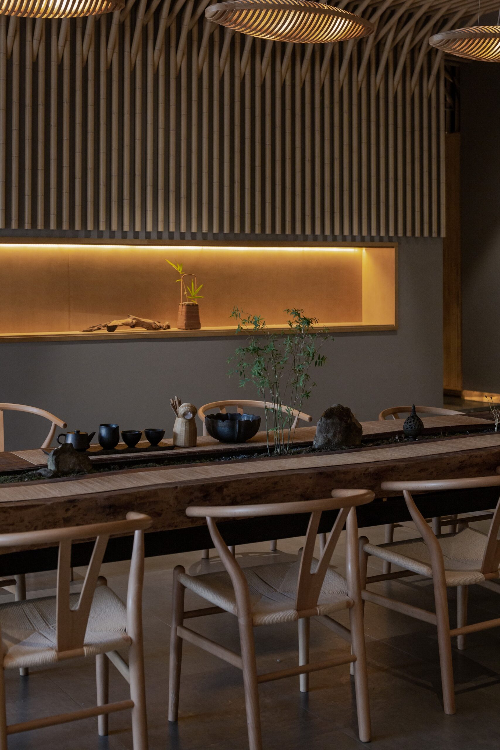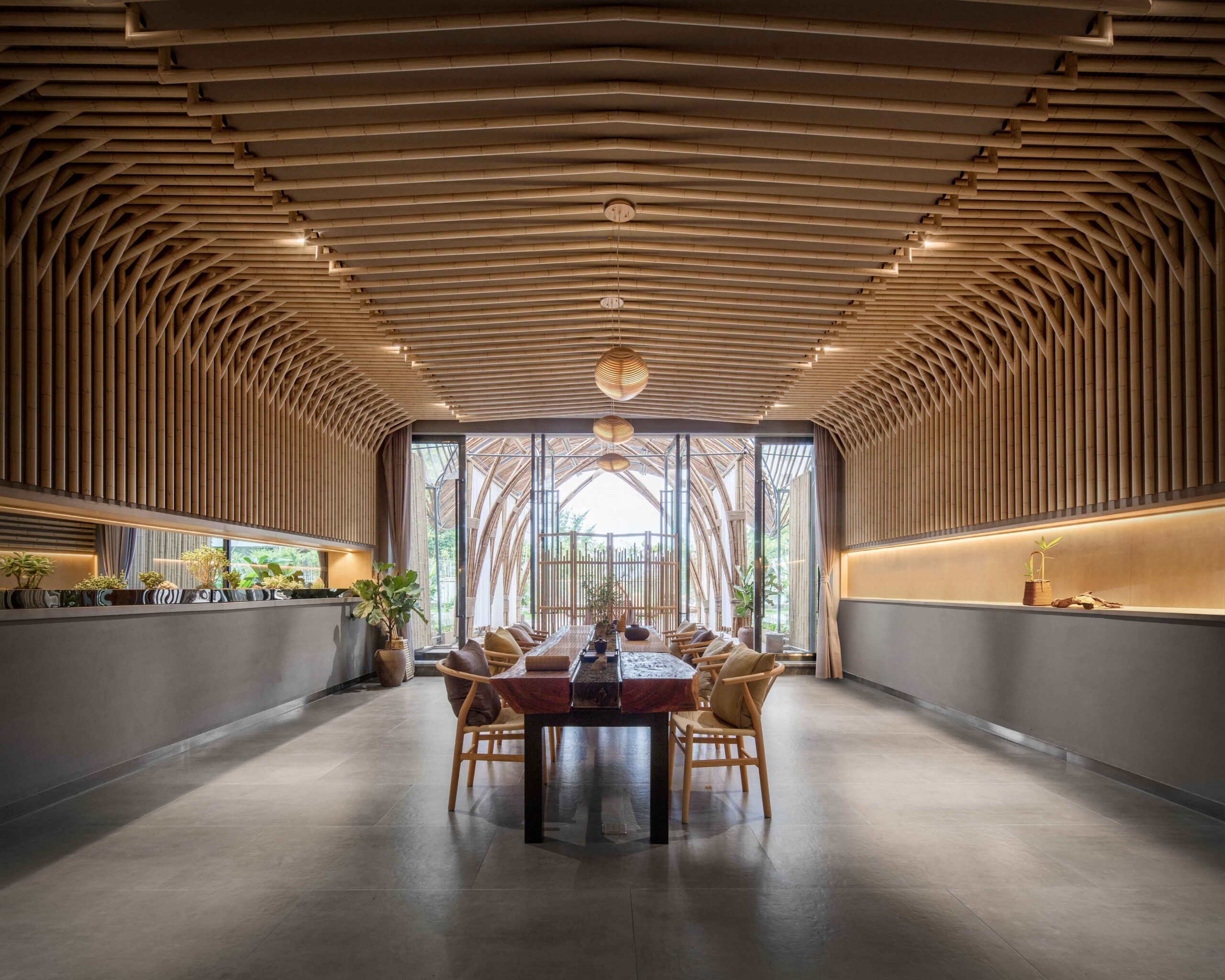 “Source” is the root of all things and the root source of No.10 Bamboo Lodge is, unsurprisingly, bamboo. I spent a year investigating the bamboo industry, both in China and also in some foreign bamboo industries. I discovered and researched other buildings made of raw bamboo, at home and abroad, and learned no one had made a whole space with bamboo as the sole decorative material. Therefore, I accepted the challenge: to create a world made solely of bamboo and sought out breakthrough applications for the material, hoping to encourage further use: with its strength, ability to swiftly regenerate, and environmentally-friendly applications.