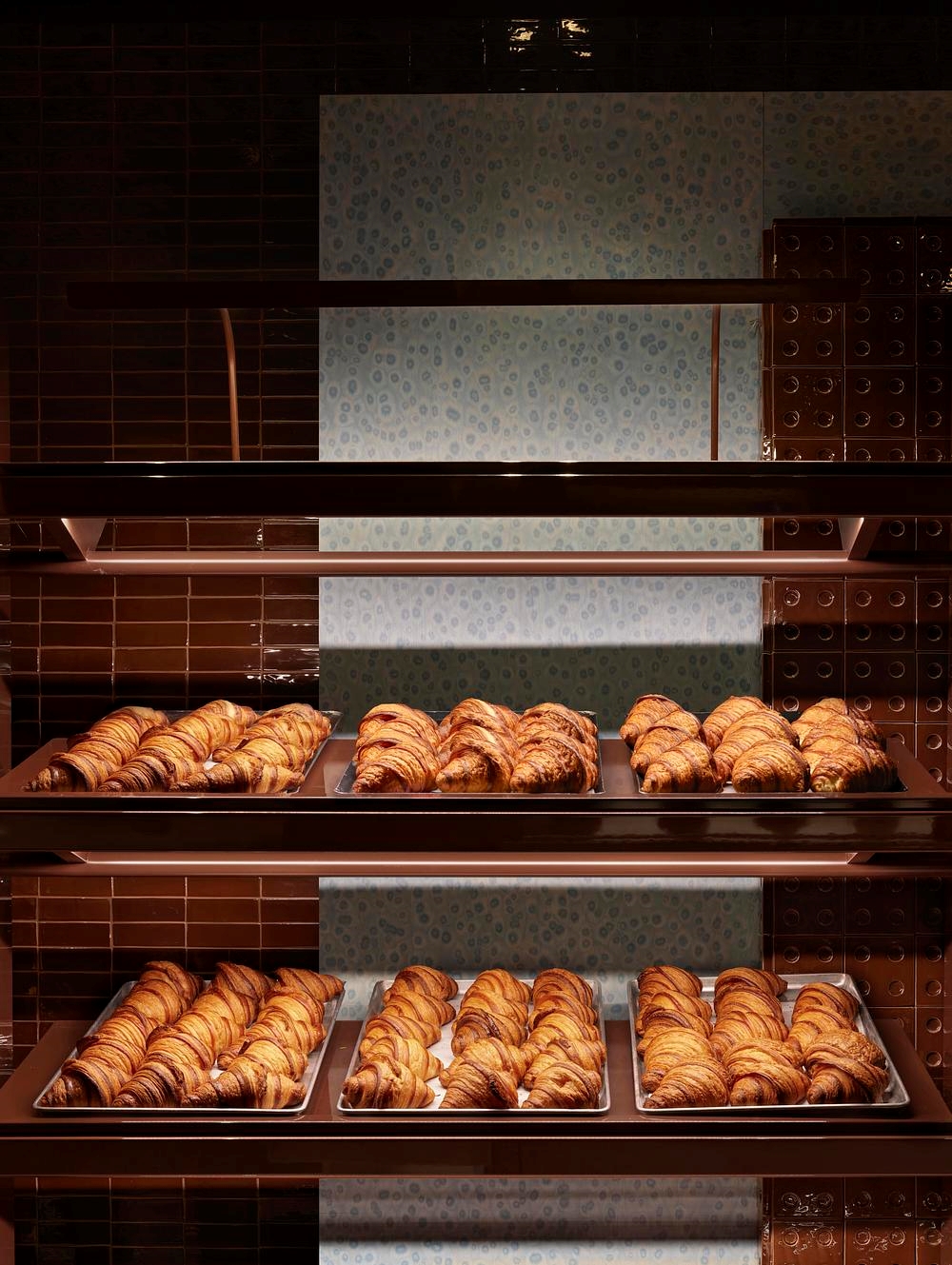 Illuminated from beneath, these vertical frames provide rhythm and establish order while providing flexibility in product presentation. The shelving creates a stratified visual field that mirrors the layered structure of illuminated dough. Dark, high-gloss dark brown ceramic throughout has been intentionally chosen to enhance light and produce depth. The dark shades of the shell are juxtaposed with mineral-textured surfaces as well as the light hues of patterned stones, which anchor the centre island. The island appears as a precise, elevated monolithic volume.