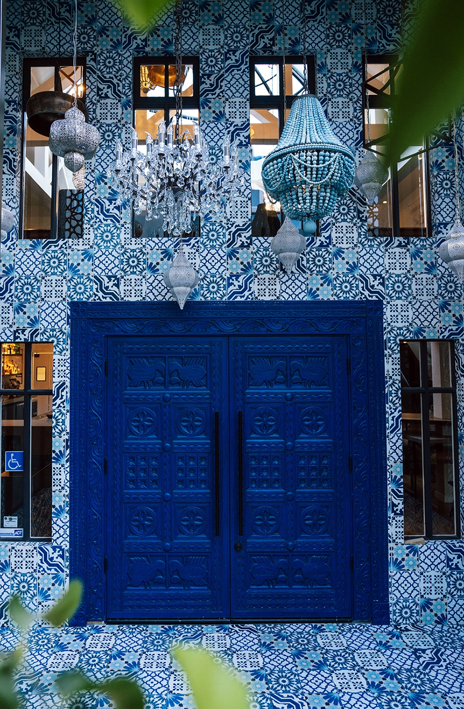 A dramatic blue entryway serves as a transition from the downtown pedestrian alley to the vintage-inspired interiors. Random patterned blue and white tiles surround a hand-carved wood door painted a deep indigo blue on all sides (including the floor). An eclectic collection of light fixtures, ranging from brass Indian drops to crystal chandeliers, illuminates the path ahead.