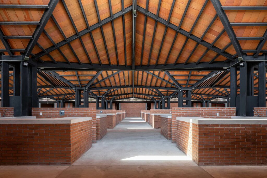 The market has a surface area of 3,425 m2. It houses 120 stores, 30 of which are located on the outside. The stalls in the market are grouped in sets of four. The “umbrella structures” are configured asymmetrically and are lower on one side. In this way, they are providing passive lighting and natural ventilation systems. All materials were left in their natural condition to allow the building to age in a dignified manner.