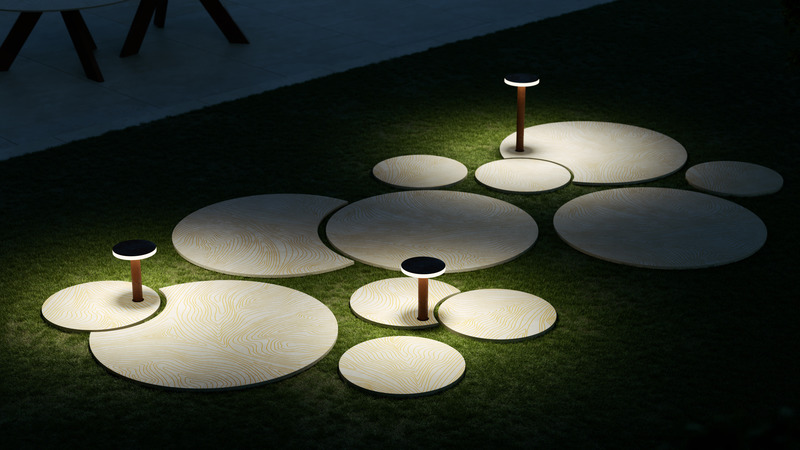 The modules can be laid directly on grass, gravel, soil, or screed. Some can be replaced by elements that incorporate an outdoor lamp, which can be used as a walkway marker or as an actual light fixture.