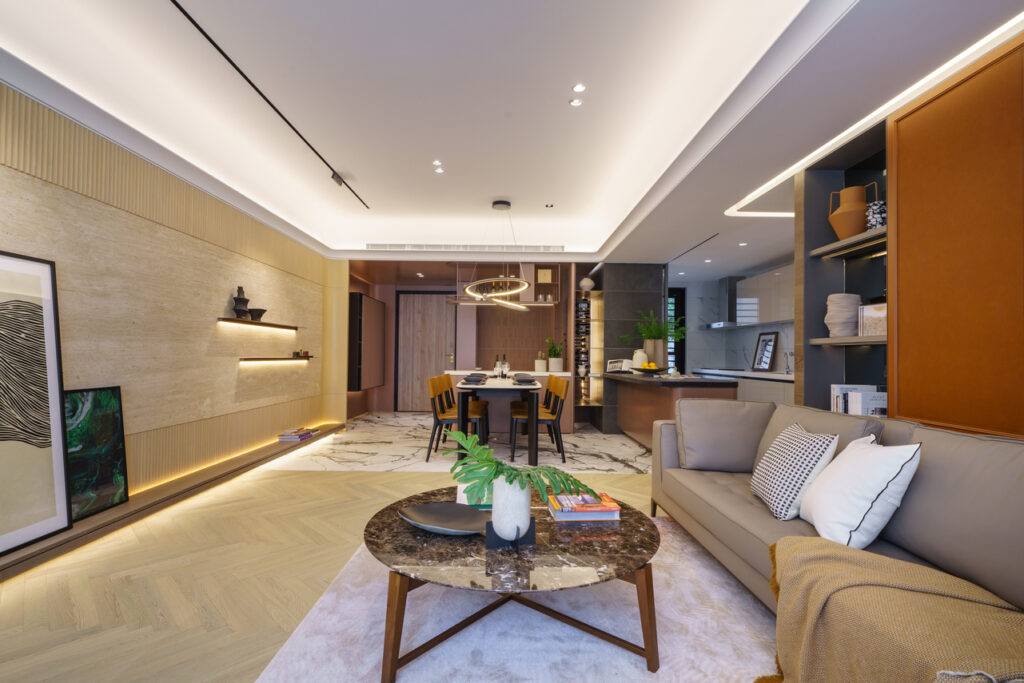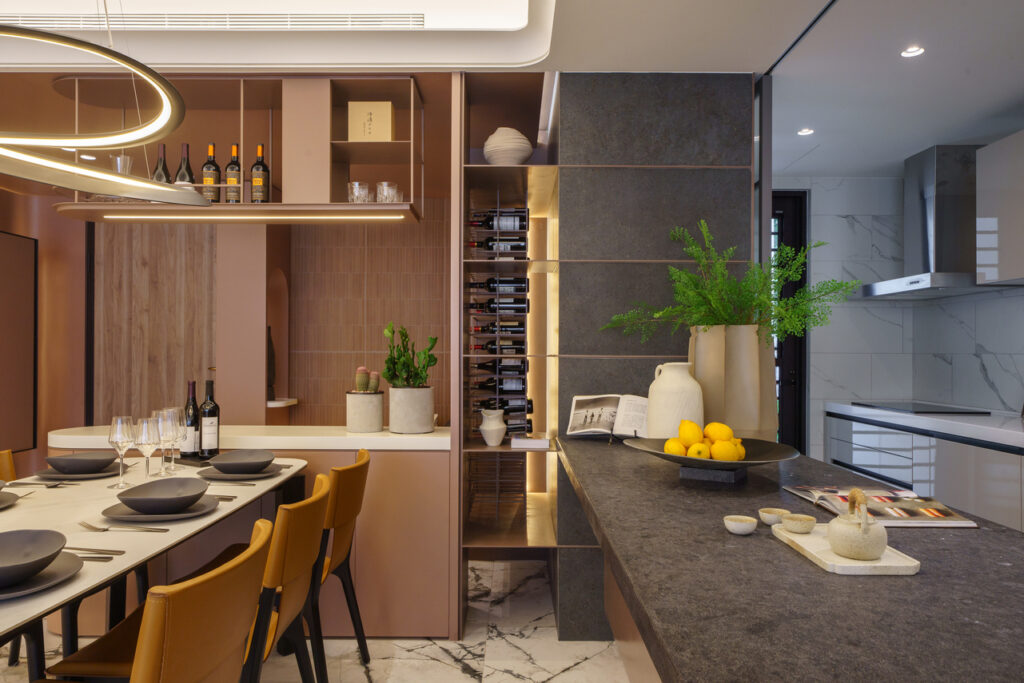 When working on the showroom, the design team maximized the public area as much as possible and used the open kitchen design to reduce rigid compartments and let the sunlight and air flow naturally. Then they focused on matching the calm color tone and natural materials such as marble, wood, and leather, giving the atmosphere a mature charm.