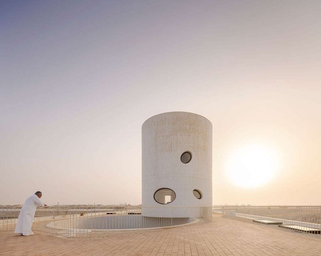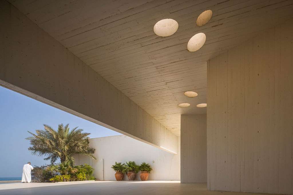 The White Fortress adapts to its natural surroundings along the Gulf Sea. Its design mitigates the challenges of the harsh Kuwaiti climate through thoughtful architectural solutions: thick walls for insulation, shaded patios for cooling, and strategically placed greenery to enhance comfort.