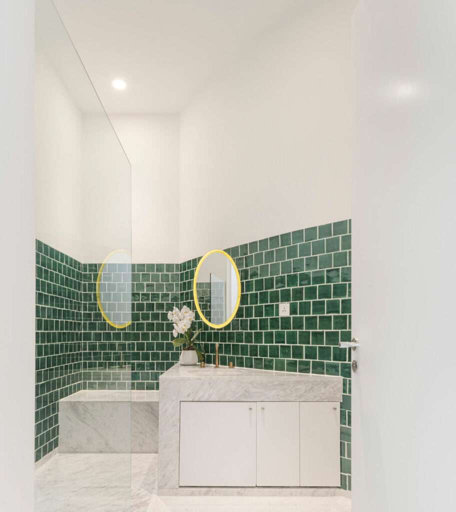 A central green “oasis” divides the residence into distinct zones, separating service areas from private and social spaces. Generously proportioned rooms open onto oval-shaped patios and lush gardens, creating seamless indoor-outdoor transitions. Glazed facades in the social areas invite natural light, balancing the solidity of the walls with an inviting sense of openness.