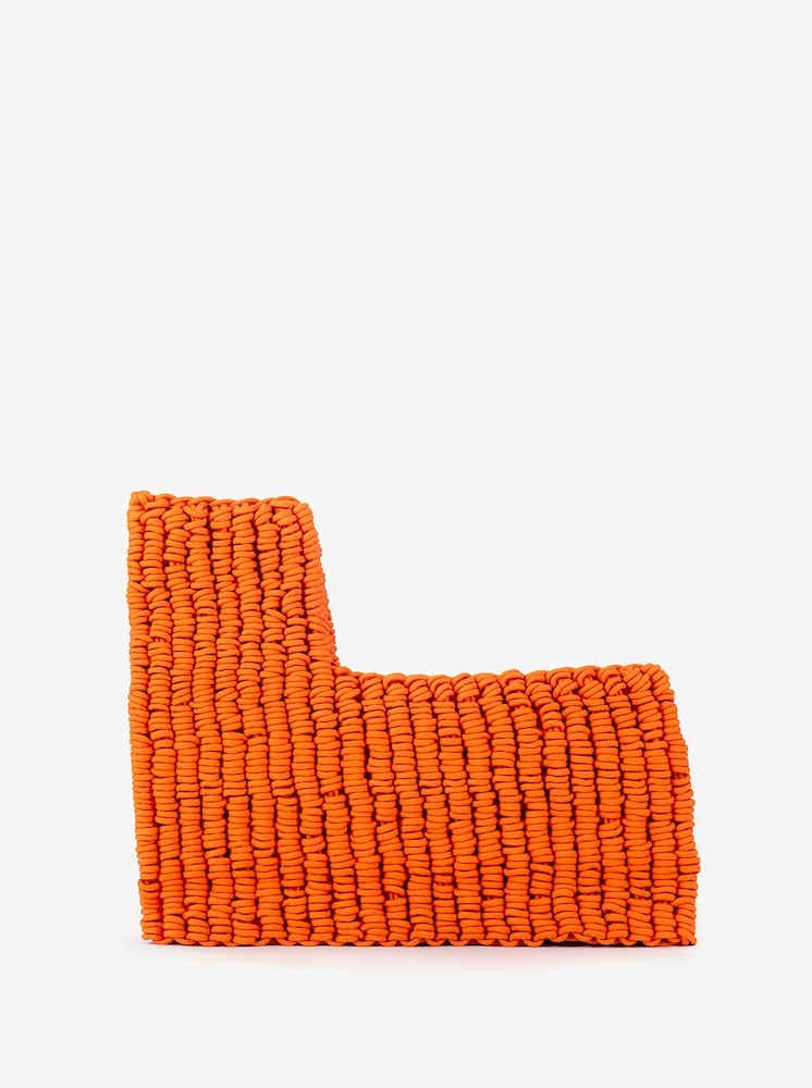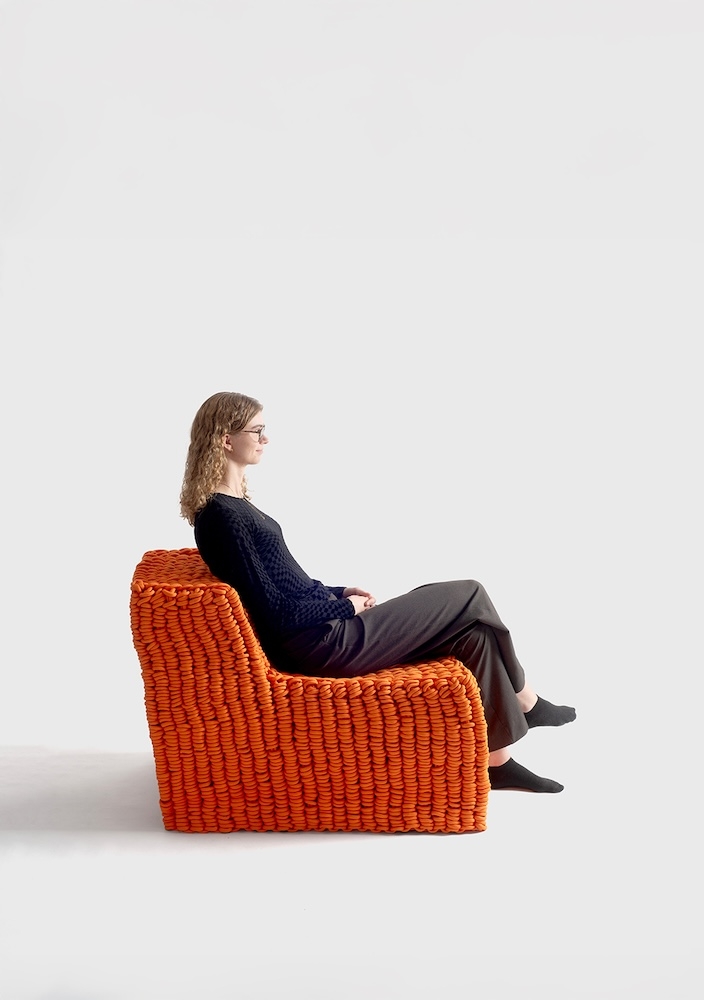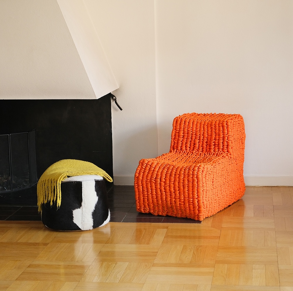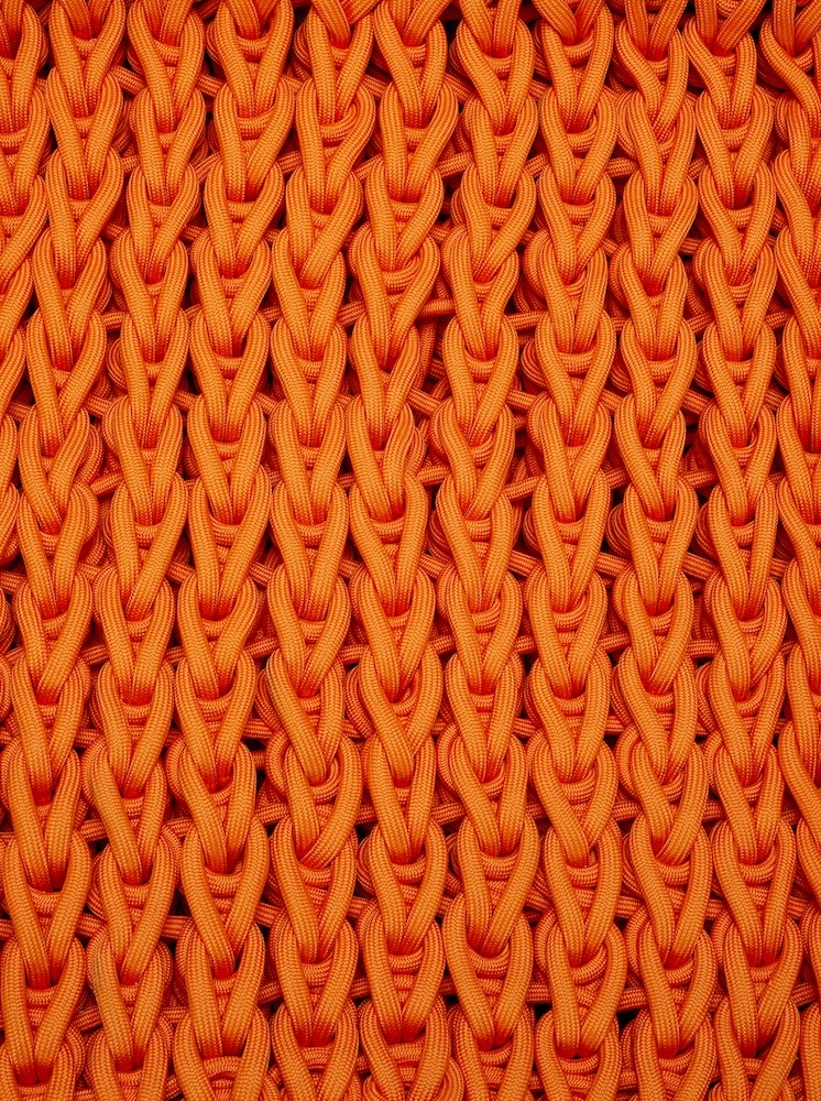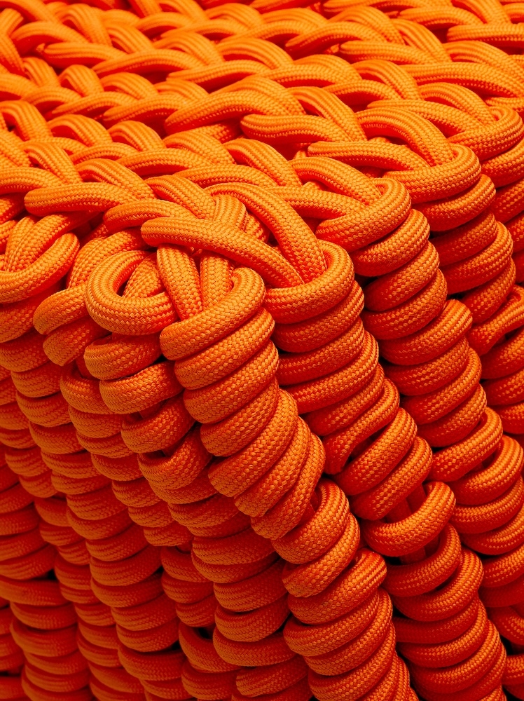 To make the chair, a special tool is needed: a platform with 345 small guides that help position the rope. The rope’s ‘warps’ (the vertical threads) are stretched from the top to the bottom of the structure. Then the rest of the rope is woven between these warps, building layers and creating a three-dimensional shape. When all 2.5 kilometres of the vivid orange 12mm shoelaces are used up, the whole thing is finished off with a single knot. This one knot ties the beginning and the end of the rope together, securing the entire structure.