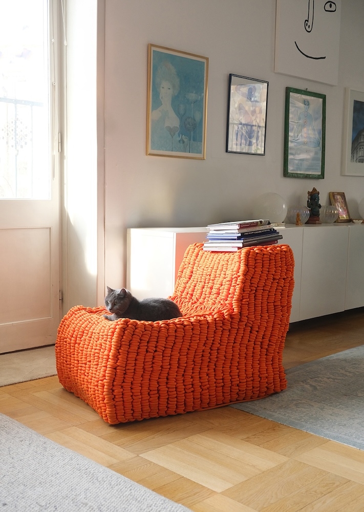 When you first see the chair, it looks quite geometric and rigid. But the cool part happens when you interact with it. As soon as you sit down, the chair deforms and softens, transforming from an austere object into a sculptural piece molded by your own body. The textile is the structure. There’s no hidden wood or metal frame; the rope does all the work, acting as both the soft ‘fabric’ and the hard ‘frame’ at the same time.